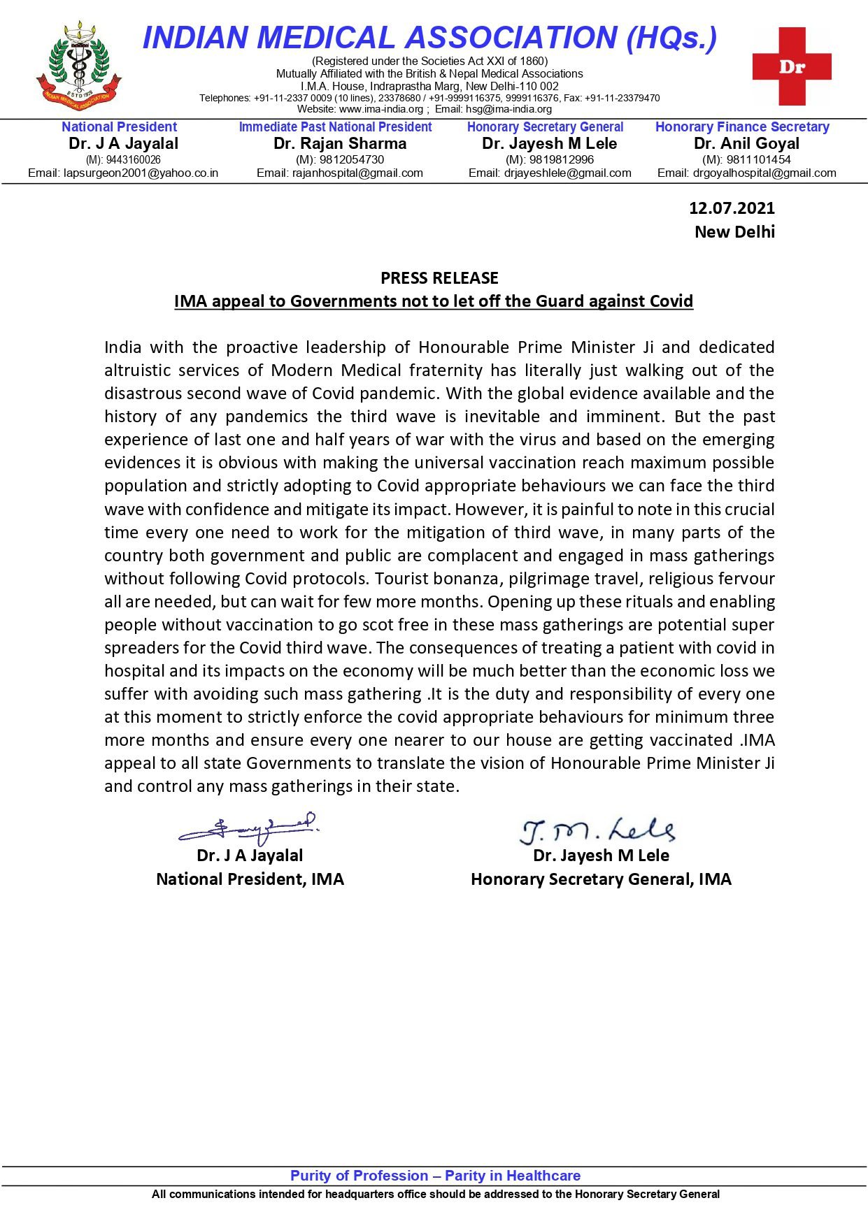 आईएमए के राष्ट्रीय अध्यक्ष डॉ.जेए जयलाल ने कहा है कि डॉक्टर अभी कोरोना की दूसरी लहर से निपटकर तुरंत बाहर निकले हैं। लेकिन देश के कई हिस्सों में लोग बचाव के आवश्यक नियमों का पालन नहीं कर रहे हैं और सामूहिक समारोहों में शामिल हो रहे हैं।