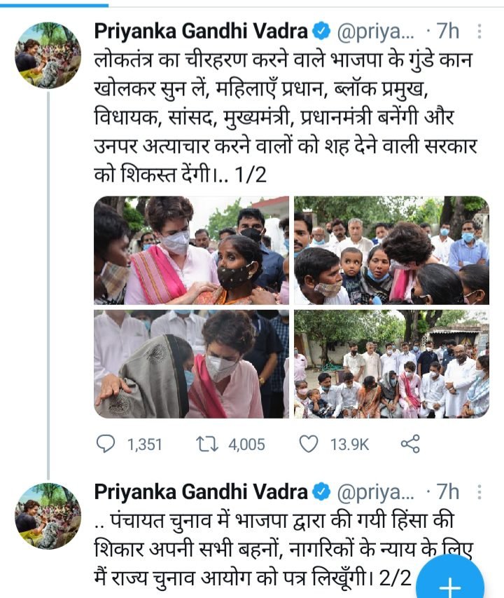 “लोकतंत्र का चीरहरण करने वाले भाजपा के गुंडे कान खोलकर सुन लें, महिलाएं प्रधान, ब्लॉक प्रमुख, विधायक, सांसद, मुख्यमंत्री, प्रधानमंत्री बनेंगी और उन पर अत्याचार करने वालों को शह देने वाली सरकार को शिकस्त देंगी।