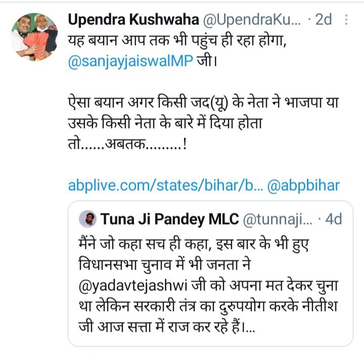“यह बयान आप तक भी पहुंच ही रहा होगा, संजय जायसवाल जी। ऐसा बयान अगर किसी जदयू के नेता ने भाजपा या उसके किसी नेता के बारे में दिया होता तो ,,,,,अबतक,,,,,! ”