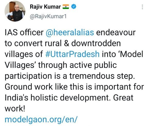 गांवों को आत्मनिर्भर बनाने के लिए वरिष्ठ आईएएस हीरा लाल IAS Heera Lal द्वारा शुरू किए गए अभियान ‘मॉडल गांव Model Gaon’ को नीति आयोग Niti Aayog ने भी सराहा है। नीति आयोग के उपाध्यक्ष राजीव कुमार Rajiv Kumar ने हीरा लाल के अभियान की तारीफ करते हुए कहा है कि भारत के समग्र विकास के लिए जमीन पर इस तरह के कार्य बहुत ही महत्वपूर्ण हैं।