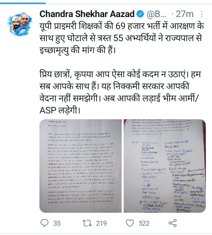 भीम आर्मी चीफ चंद्रशेखर आजाद रावण ने ओबीसी व एससी वर्ग के छात्रों से ऐसा कदम नहीं उठाने की अपील की है। उन्होंने कहा है, “आपकी लड़ाई भीम आर्मी लड़ेगी।”