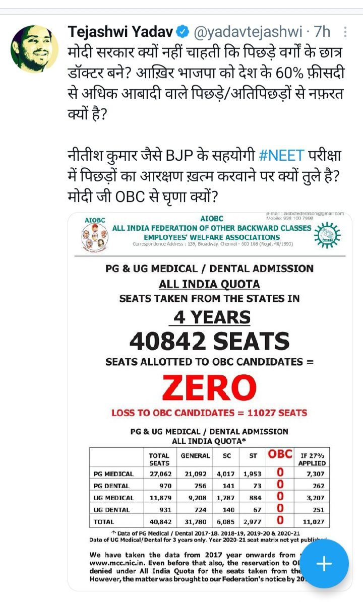 आखिर मोदी सरकार क्यों नहीं चाहती कि पिछड़े वर्गों के छात्र डॉक्टर बने? आखिरकार भाजपा को देश के 60 फीसदी से अधिक आबादी वाले पिछड़ों से नफरत क्यों है? नीतीश कुमार जैसे बीजेपी के सहयोगी नीट परीक्षा में पिछड़ों का आरक्षण खत्म करवाने पर क्यों तुली है? मोदी जी ओबीसी से घृणा क्यों?”