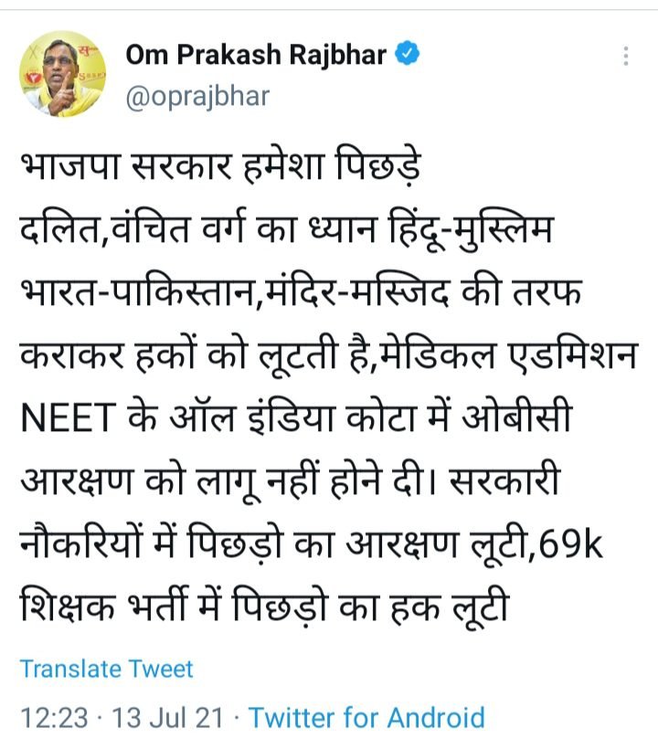 सुहलदेव भारतीय समाज पार्टी के मुखिया ओम प्रकाश राजभर कहते हैं,