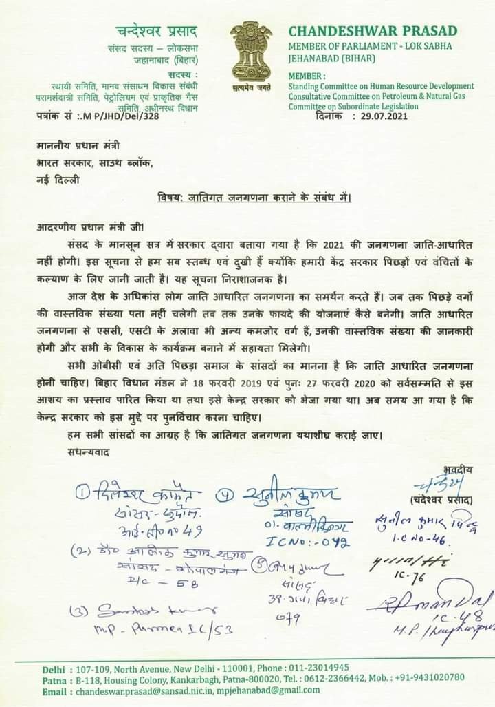 जेडीयू के जहानाबाद से सांसद चंदेश्वर प्रसाद JDU MP Chandeshwar Prasad के नेतृत्व में जेडीयू सांसदों ने जातीय जनगणना की मांग को लेकर हस्ताक्षर अभियान चलाया है एवं प्रधानमंत्री नरेंद्र मोदी को पत्र भेजकर जातीय जनगणना की मांग की है।
