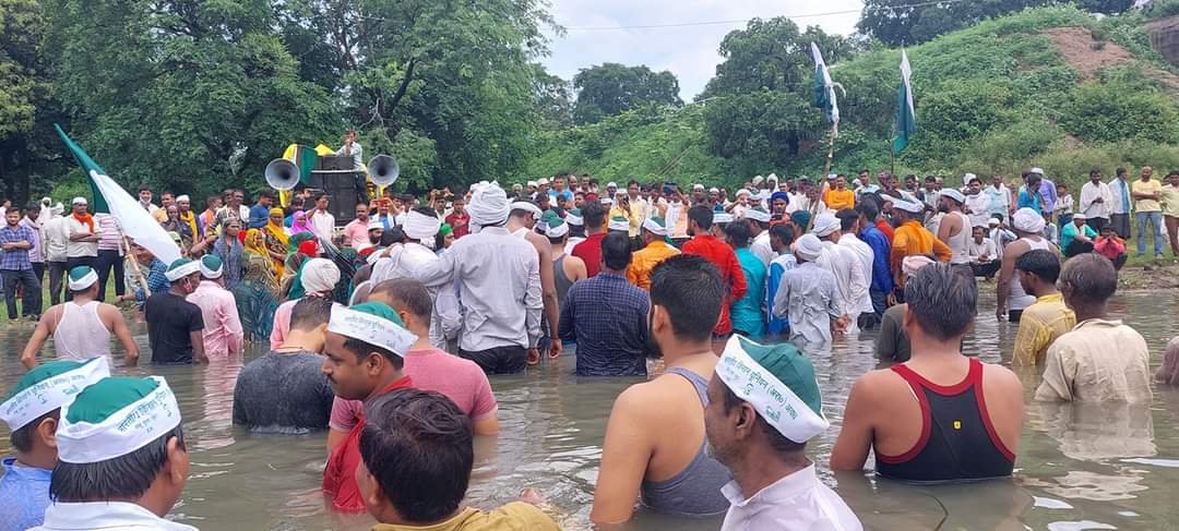 गोमती नदी Gomti River में 28 घंटे जल सत्याग्रह Water Satyagrah से किसानों Farmers के पैर सफेद हो गए